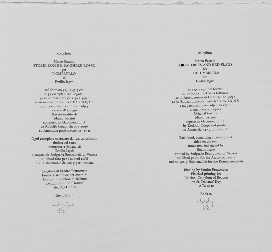 “L’Ombrello” è un testo inedito di Marco Bazzini composto in Garamond c.14 stampato da Rodolfo Campi su puro cotone Amatruda da 200 g. con cancellatura di Emilio Isgrò, serigrafata da Berardinelli di Verona su stampa fotografica Ilford Art per i numeri arabi, le dedicate ad personam e l’obbligo; in stampa serigrafica su Etching Hahnemühle le copie in numeri romani. Numero e firma in ante, titolo e data al retro, a cura dello stesso artista.